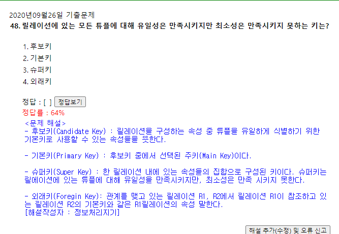 - 후보키(Candidate Key) : 릴레이션을 구성하는 속성 중 튜플을 유일하게 식별하기 위한 기본키로 사용할 수 있는 속성들을 뜻한다.
