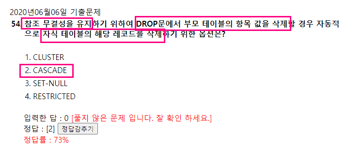 <문제 해설> DDL : PRIMARY KEY : 기본키 정의 / FOREIGN KEY : 외래키 정의 UNIQUE : 지정 속성은 중복값 가질 수 없음 / NO ACTION : 변화가 있어도 조취를 취하지 않음 CASCADE : 참조 테이블 튜플 삭제 시 관련 튜플 모두 삭제 및 속성 변경 시 속성값 모두 변경 RESTRICTED : 타 개체가 제거할 요소를 참조중이면 제거를 취소 SET NULL : 참조 테이블 변화 시 기본 테이플 관련 속성값 Null로 변경 SET DEFAULT : 참조 테이블 변화 시 기본테이블의 관련 튜플 속성값을 기본값으로 변경 CONSTRAINT : 제약 조건 이름 지정 / CHECK 속성값에 대한 제약 조건 정의 DML : INSERT INTO ~ VELUES : 튜플 삽입 / DELETE FROM~ WHERE : 튜플 삭제 UPDATE ~ SET ~ WHERE : 튜플 내용 변경 / SELECT~FROM~WHERE : 튜플 검색 DISTINCT : 중복 튜플 발견 시 그 중 첫번째 하나만 검색 / DISTINCTROW : 중복 튜플 제거 및 하나만 검색 (튜플 전체를 대상으로 검색) PREDICATE : 검색할 튜플 수 제한 / AS 속성명 정의 ORDER BY : 특정 속성 기준으로 정렬 후 검색할 때 ASC : 오름차순 / DESC : 내림차순 / 생략 시 오름차순 GROUP BY : 특정 속성 기준 그룹화하여 검색할 때 사용 having절과 같이 사용되어야함 |