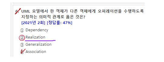 Realization(실체화) : 한 객체가 다른 객체에 의해 오퍼레이션을 수행하도록 지정
